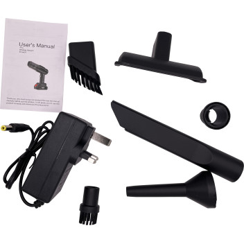 Supplied With: Vacuum unit, rechargeable battery, charger, crevice tool, wide nozzle, brush attachments, and user manual.