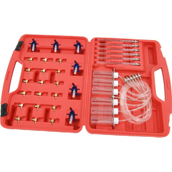 Professional leak-off (return flow) test kit for diagnosing common rail diesel injectors. Measures and compares the amount of fuel each injector returns to the deposit tank, helping identify worn, stuck, or imbalanced injectors quickly and safely. For on-vehicle testing of up to six injectors with adaptors to suit the most common systems.