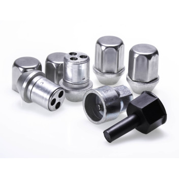 High-security locking wheel nut set featuring a free-spinning outer collar that defeats gripping tools. Precision-made from hardened, tempered steel for maximum strength, with a corrosion-resistant finish for long service life. The unique head design is resistant to drilling and punching.