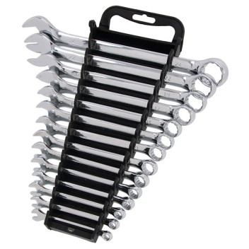 This 14-piece Combination Spanner Set provides a comprehensive range of sizes for a variety of fastening tasks. Each spanner features a polished finish for durability and corrosion resistance, while the included storage rack keeps your tools organised and easy to access.