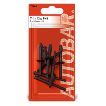 The AUTOBAR TF165 trim clip is a versatile push-type fastener compatible with FORD, CHRYSLER, and GM vehicles. Designed for secure panel mounting, it provides a firm hold in applications such as bumpers, splash guards, and interior trims.