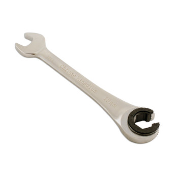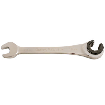 19mm ratchet flare nut wrench designed with a ratcheting ring flare end, allowing secure engagement on flare nuts while also functioning as a standard ratchet ring spanner. Ideal for brake, fuel and hydraulic line work where access is limited and a conventional spanner may slip. Manufactured from chrome vanadium with a durable satin finish for strength and corrosion resistance.
